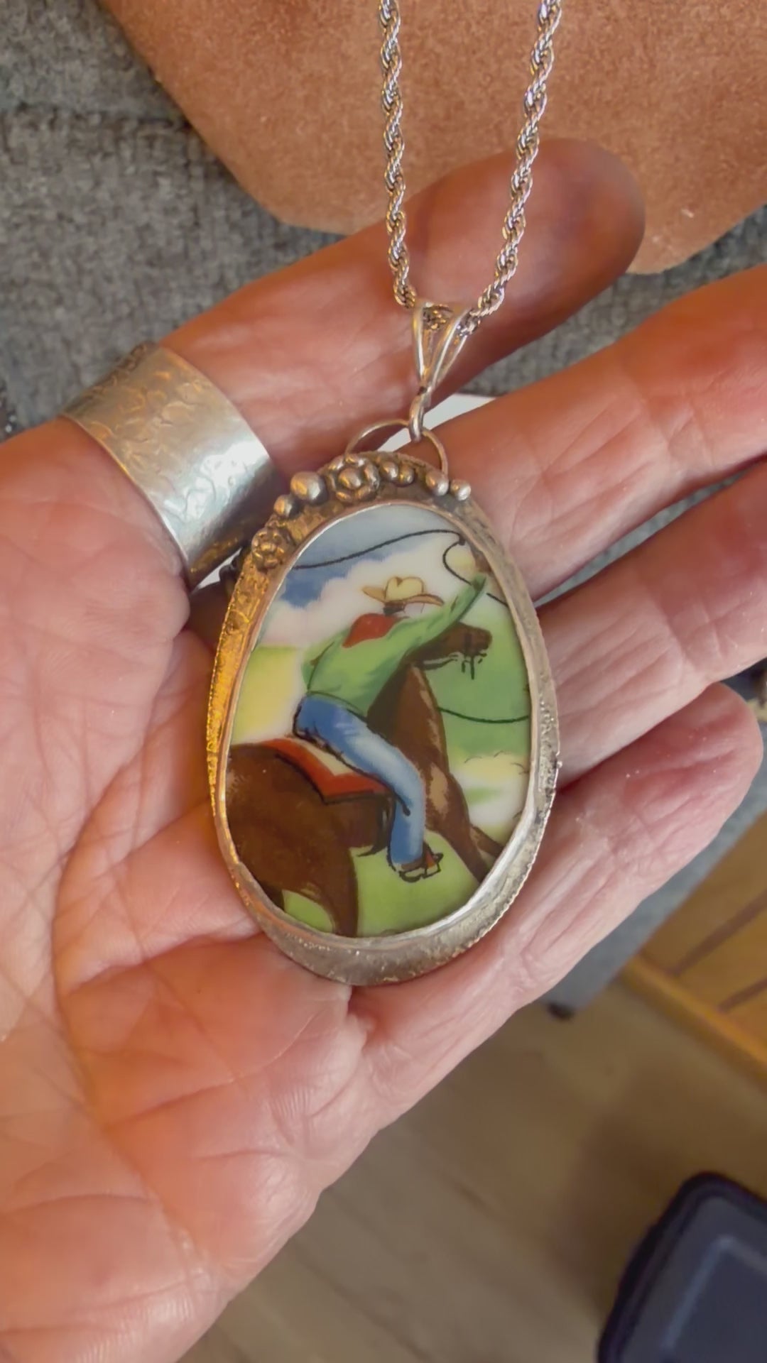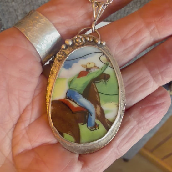 A true piece of Western character, this one-of-a-kind pendant features a vintage ceramic plate fragment showcasing a classic cowboy mid-ride, full of motion and grit. The scene is carefully set into a handcrafted setting formed from a repurposed Kennedy half dollar, giving it a rugged, story-rich foundation. Handcrafted excellence with sterling silver embellishments