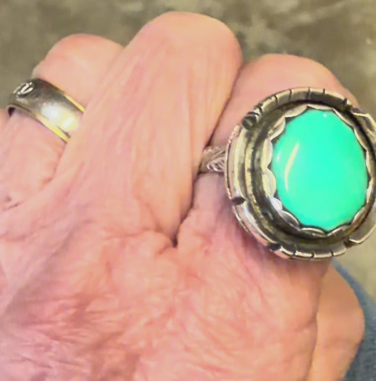 This genuine Cloud Mountain turquoise sits bold and proud in a hand forged sterling silver setting, wrapped in a rugged, dimensional bezel that feels right at home in the West. The bright blue stone carries that clear mountain sky color — the kind you only see where the wind never quits and the horizon runs forever.