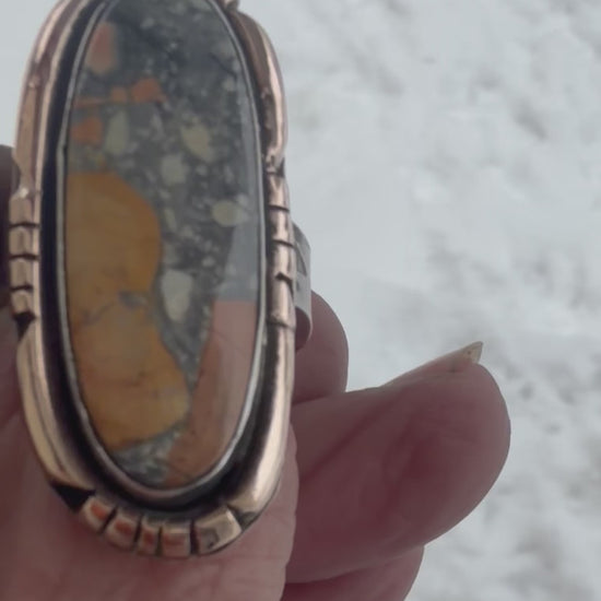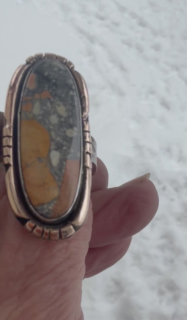A striking Maligano Jasper cabochon takes center stage in this handcrafted mixed-metal ring. Earthy tones of warm ochre, soft gray, and creamy stone fragments create a natural mosaic—like a desert cliff meeting a stormy sky.